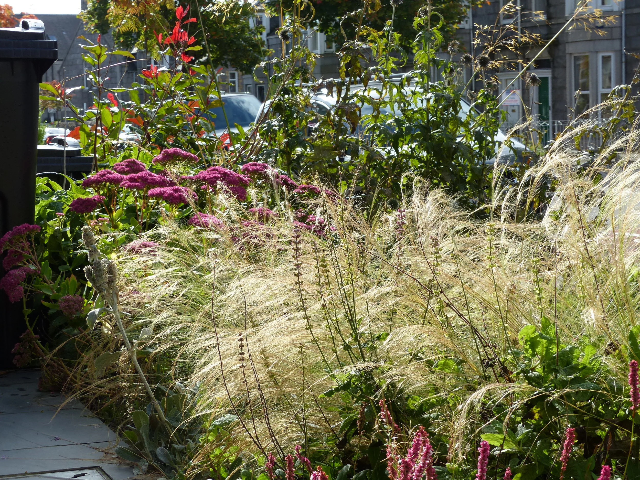 /This tired front garden was brought to life with colourful perennial planting and bright planters.